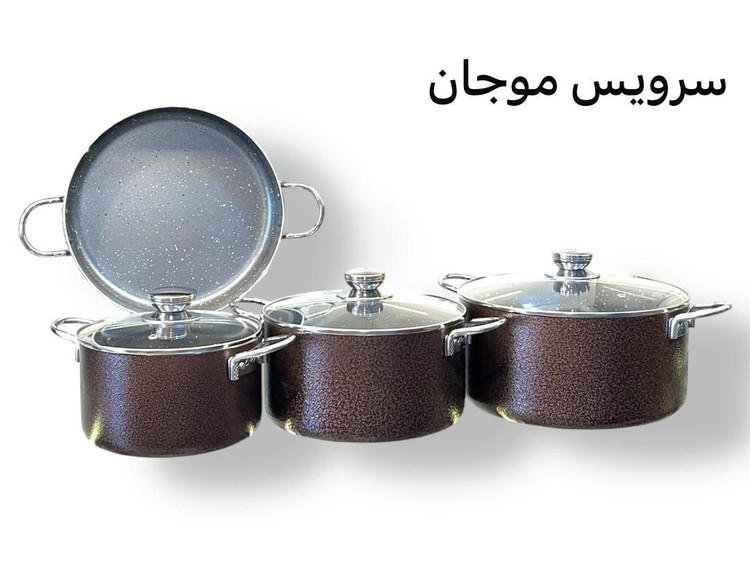 سرویس قابلمه هفت پارچه موجان شامل:قابلمه سایز ۲۸,قابلمه سایز ۲۴,قابلمه سایز ۲۰و تابه سایز ۲۸میباشد که با درب های سایز ۲۰+۲۴+۲۸ در بسته بندی محصول قرار دارند،سرویس دارای ضخامت ۳میل می باشد که با گرانیت وارداتی ترکیبی استثنایی را برای پخت و پز و شست آسان به وجود اورده،کیفیت این محصول اون رو گارانتی میکنه.